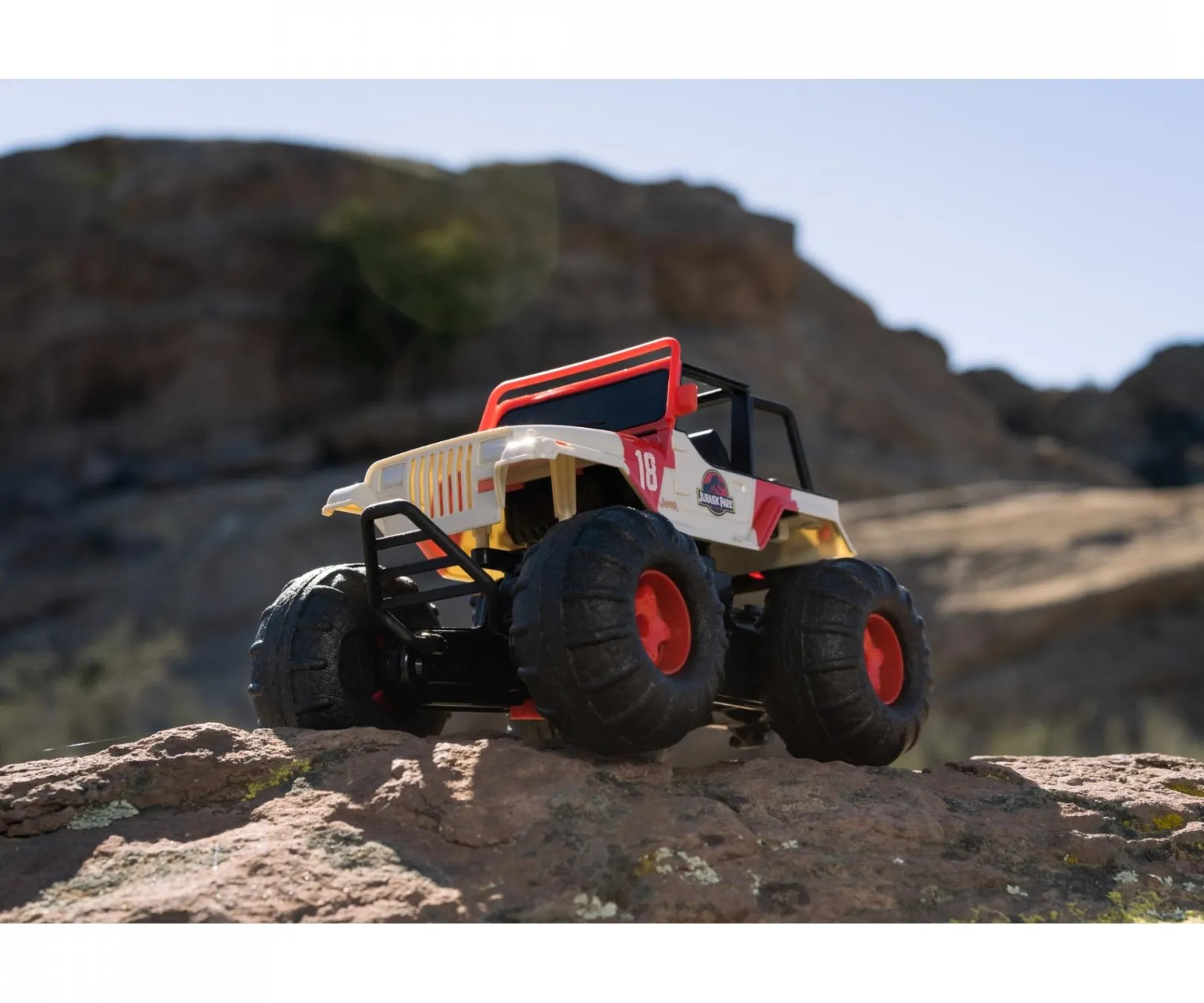Überhole die mächtigen Dinosaurier, die den Park durchstreifen! Mach dich bereit für ein Abenteuer jenseits der Vorstellungskraft mit diesem geländegängigen Jeep im Maßstab 1:16, dessen Design direkt aus dem Film stammt! Erlebe die Fahrt deines Lebens, während du dich mit einer voll funktionsfähigen Fernsteuerung in Sicherheit bringst! Das Modell fährt auf Wasser und auf Land.